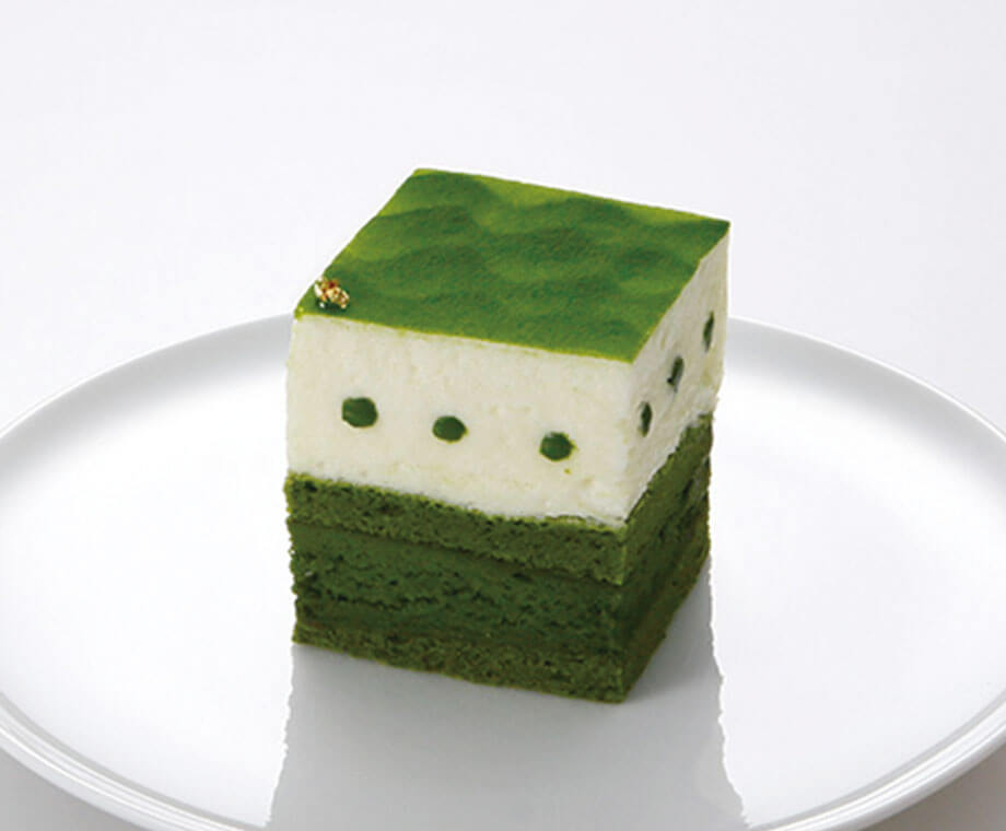 香り高いお濃茶のフォンダンに軽い口溶けのミルクムースを重ねました。随所に忍ばせたお濃茶の旨味とミルクの乳味がお口の中に広がります。