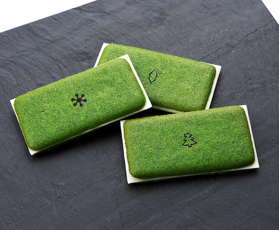 京 宇治 白川の厳選茶葉をはじめとする宇治茶を使用。お濃茶ラングドシャ「茶の菓」。クリスマス限定パッケージで登場。
