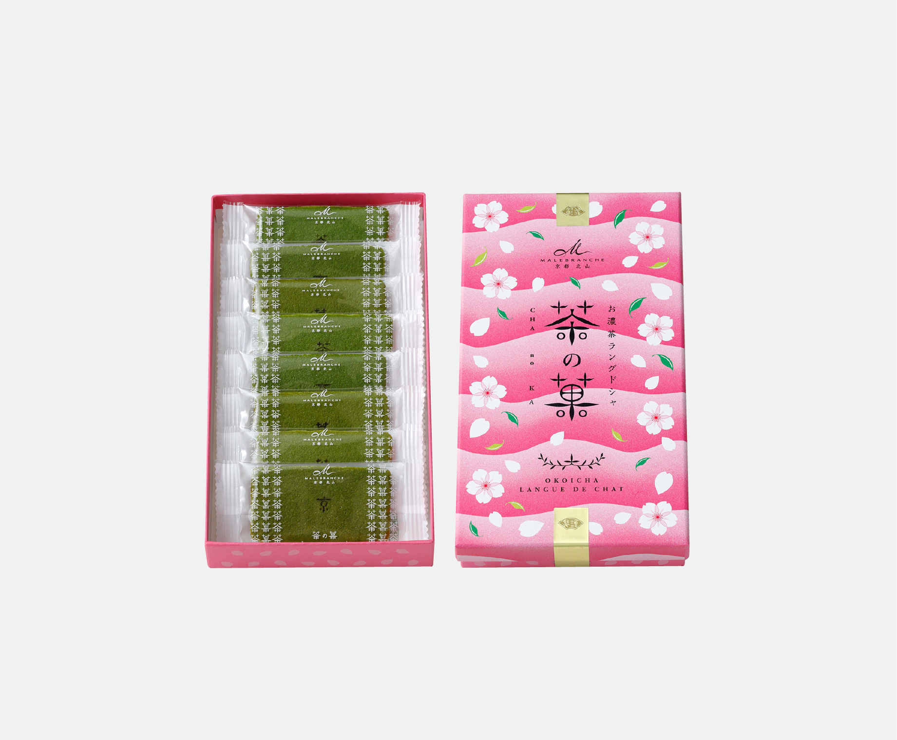 京 宇治 白川の厳選茶葉をはじめとする宇治茶を使用。京スイーツの定番から世界品質へ。こだわりの茶葉を丁寧に見極め、もっともふさわしい色・味・香りのお濃茶に調合。シェフの技と五感で、口どけのよいラングドシャに焼き上げ、ミルク感豊かなオリジナルホワイトチョコレートを挟みました。春限定パッケージで登場。