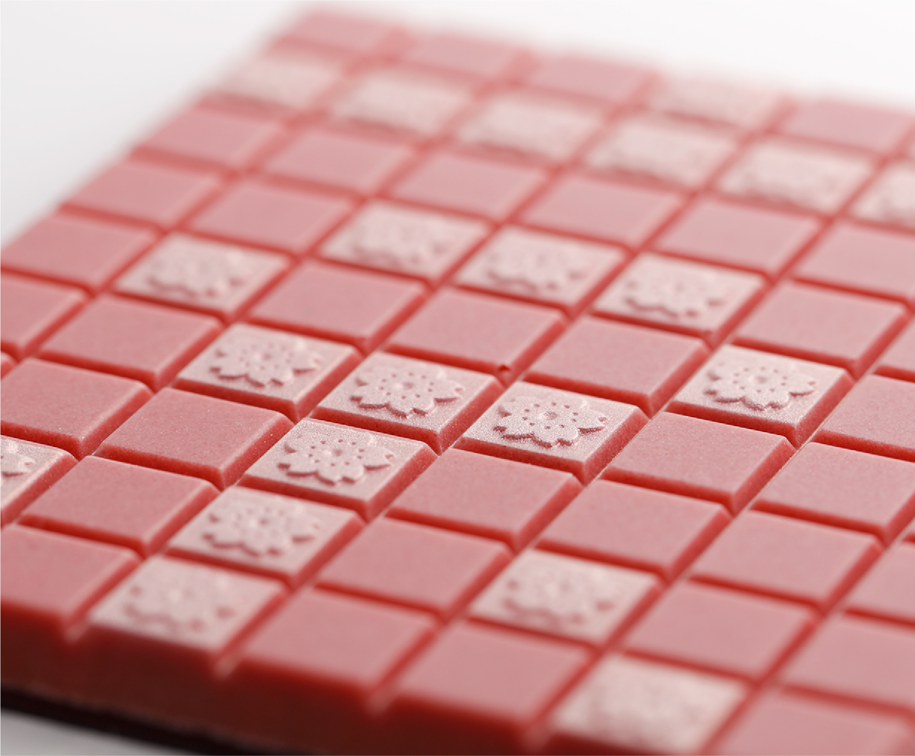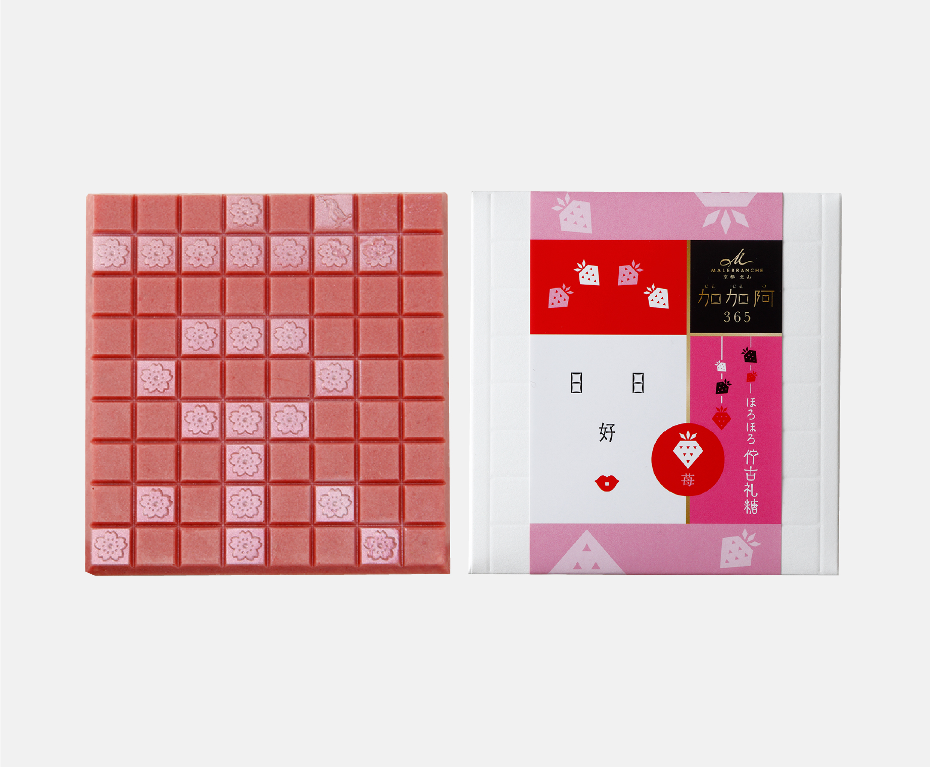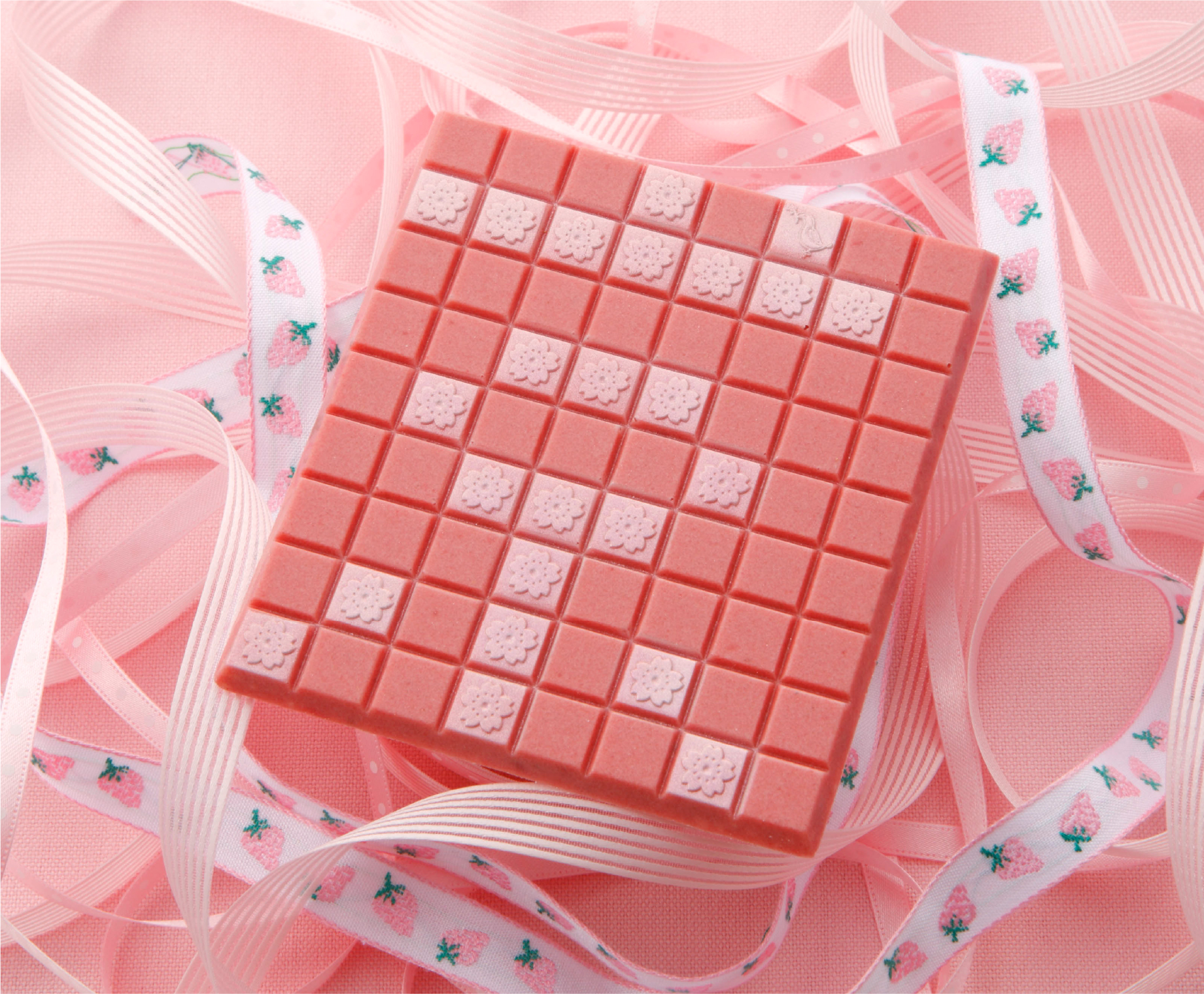 甘酸っぱいドライ苺と、苺の種のプチプチ感は道明寺粉で。さくらの紋を散らした春らしい香りのチョコレート。