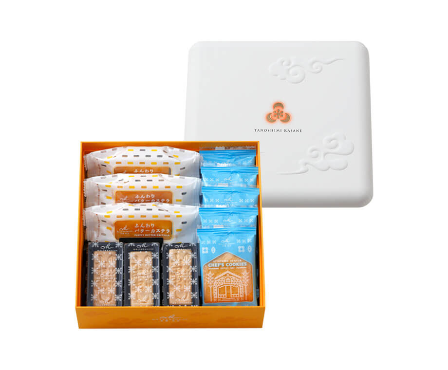 | 内 容 | ふんわりバターカステラ×3、北山本店シェフクッキー×5、もなかかお×3 |