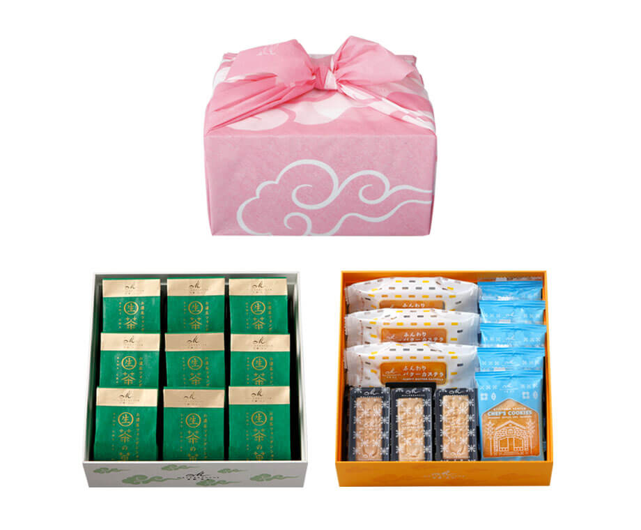 | 内 容 | 一段目:生茶の菓9コ入、二段目:楽しみかさね[ふんわりバターカステラ×3、北山本店シェフクッキー×5、もなかかお×3] |