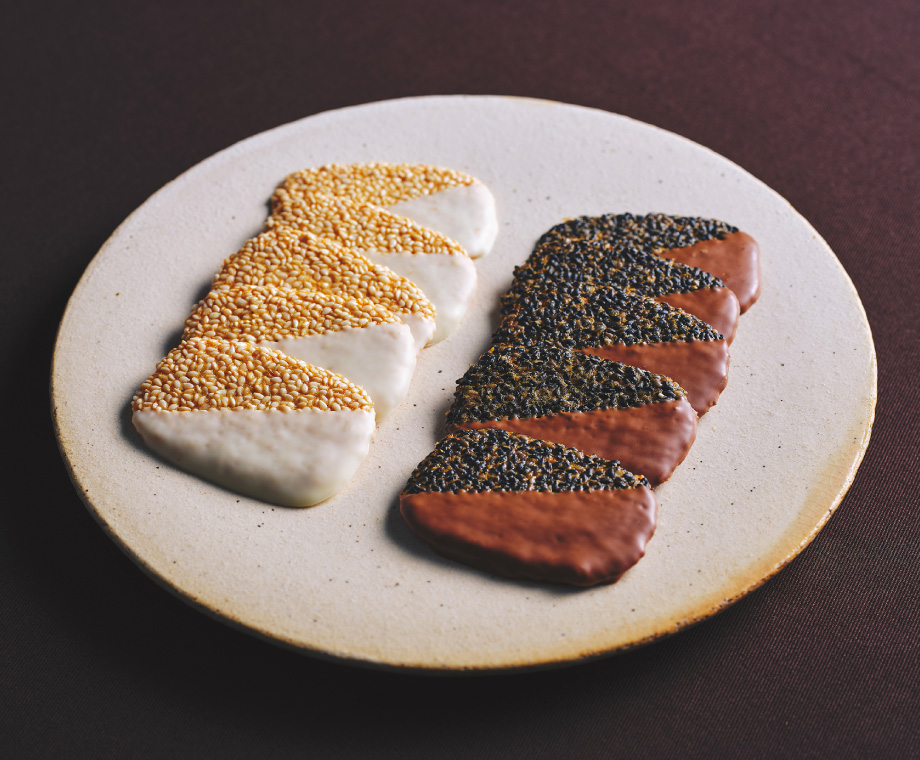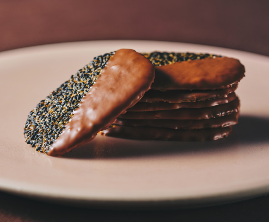 香ばしいごまとチョコレートが織りなす、パリパリとした食感が楽しい冬だけの特別なアソート。薄く繊細に焼き上げた生地に、直火焙煎ごまの豊かな風味を生かし、それぞれに調和するチョコレートを半分だけまとわせました。黒ごまの深いコクと香ばしさにやさしい甘みを添えた〈黒ごまミルクチョコレート〉と、まろやかな甘みと香ばしさを引き立てた〈白ごまホワイトチョコレート〉。ごまの香りとチョコレートの余韻を楽しむ、贈りものにもぴったりの季節限定の詰め合わせです。