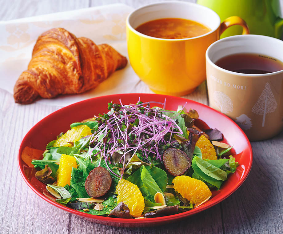 大ぶりにカットした栗とオレンジ、食感のアクセントにアーモンドスライスをトッピングしました。具だくさんなスープとドリンクも付いてボリューム満点、モーニングやブランチにぴったりのメニューです。