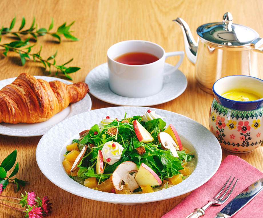 サラダには生のマッシュルームとみずみずしいグリーンリーフを使い、シャキシャキのりんごを食感のアクセントに。キャラメリゼしたりんごの甘みとすりおろしりんごの酸味がベストマッチのドレッシングを添えて。クリームと一緒に絡めてお召し上がりください。