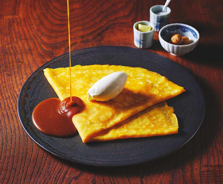 濃厚な味わいが特徴の赤たまごと米粉を使った生地は、独特の風味と食感が魅力。外はパリッと、中はふんわりと焼き上げています。目の前でおつくりするからこそ際立つバターやキャラメルの香りに包まれるひと品。上品な甘さでミルク感たっぷりのアイスクリームを添えてご提供します。